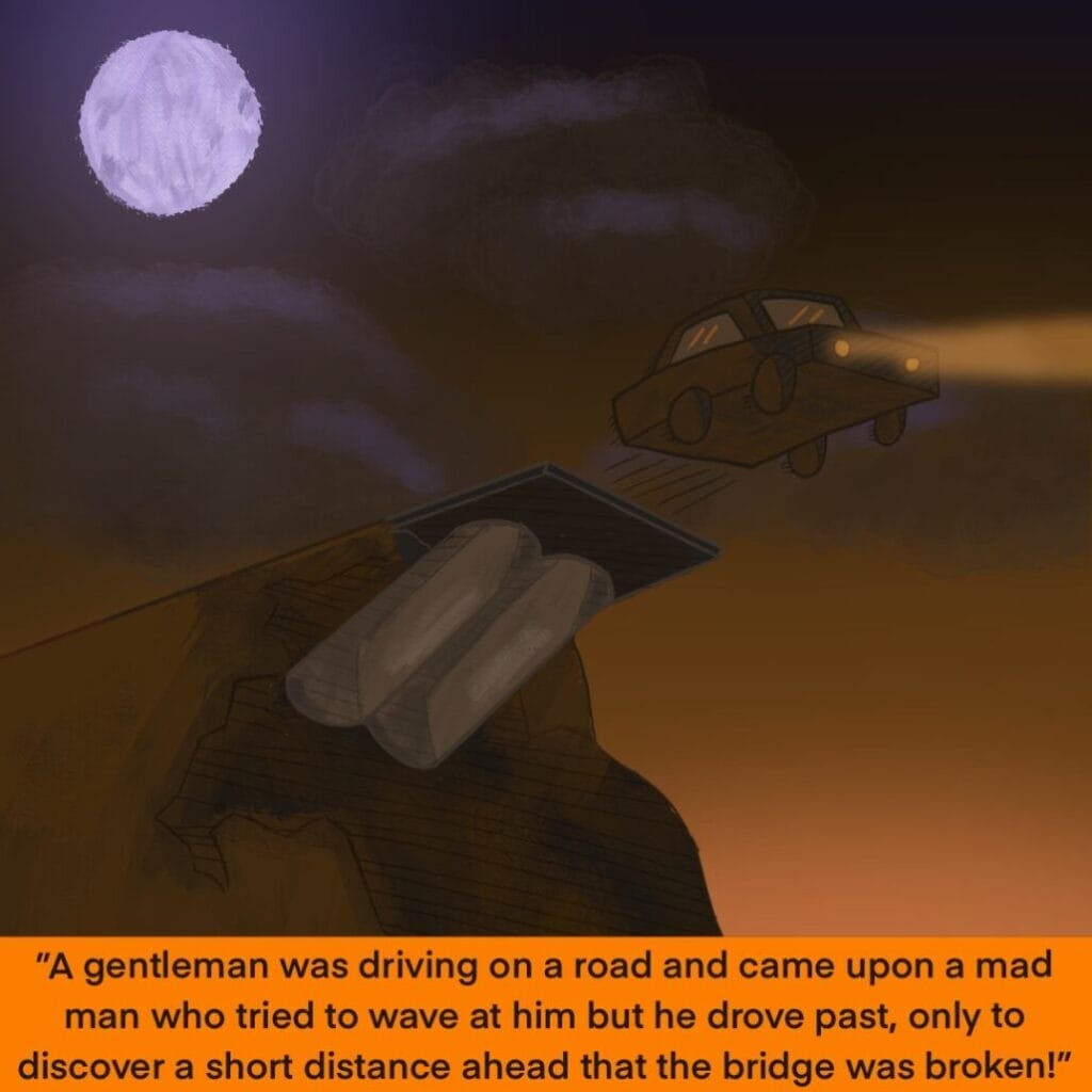A gentleman was driving on a road and came upon a mad man who tried to wave at him but he drove past, only to discover a short distance ahead that the bridge was broken!